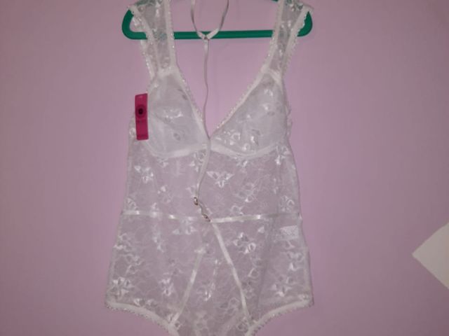 Body de encaje con collar de elástico regulable y removible. Talle 04 (cede hasta T. 05) Color: blanco o nugat. Marca: SIGRY